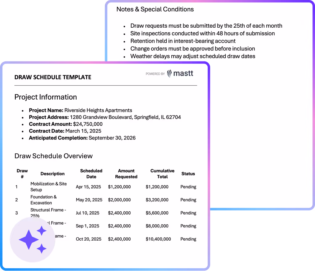 Use Mastt to stay organized, track budgets, and keep your documentation ready so every draw moves forward without delay.
