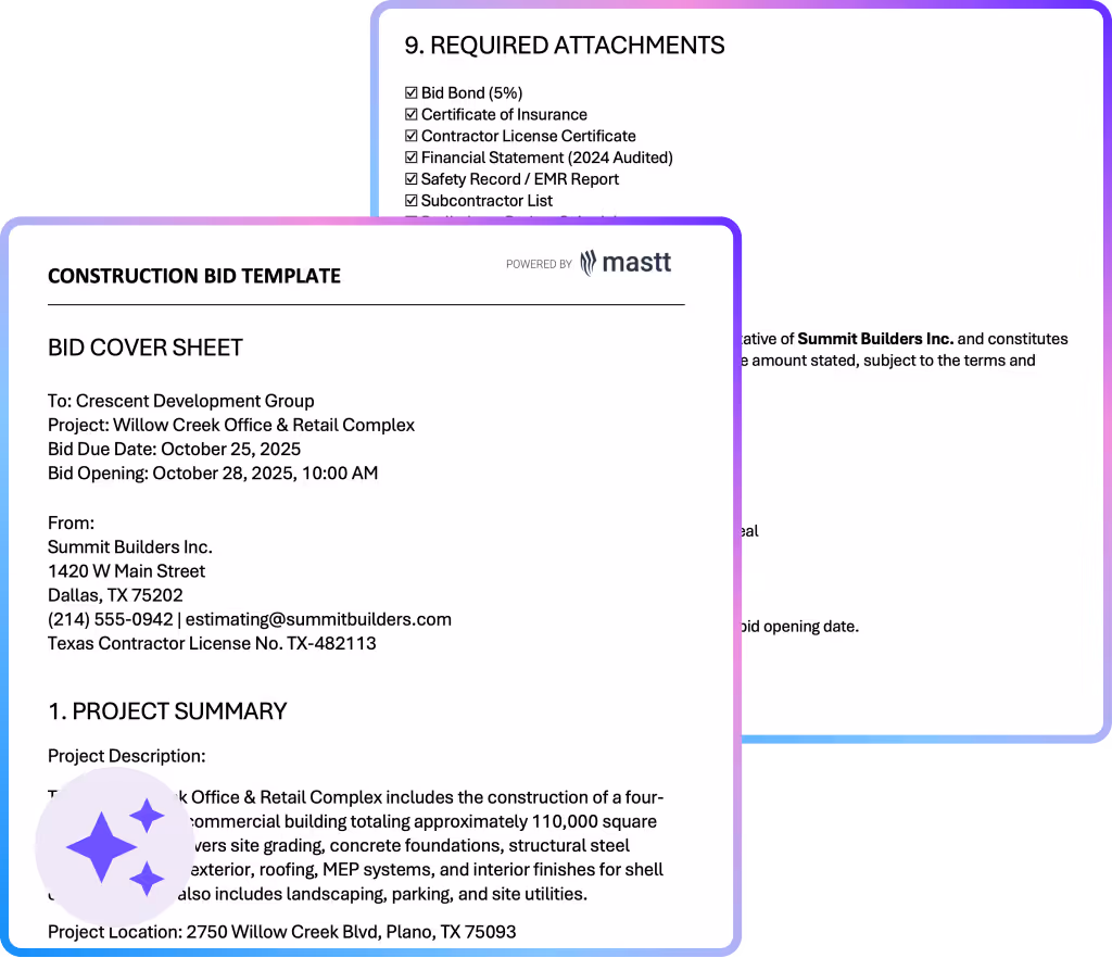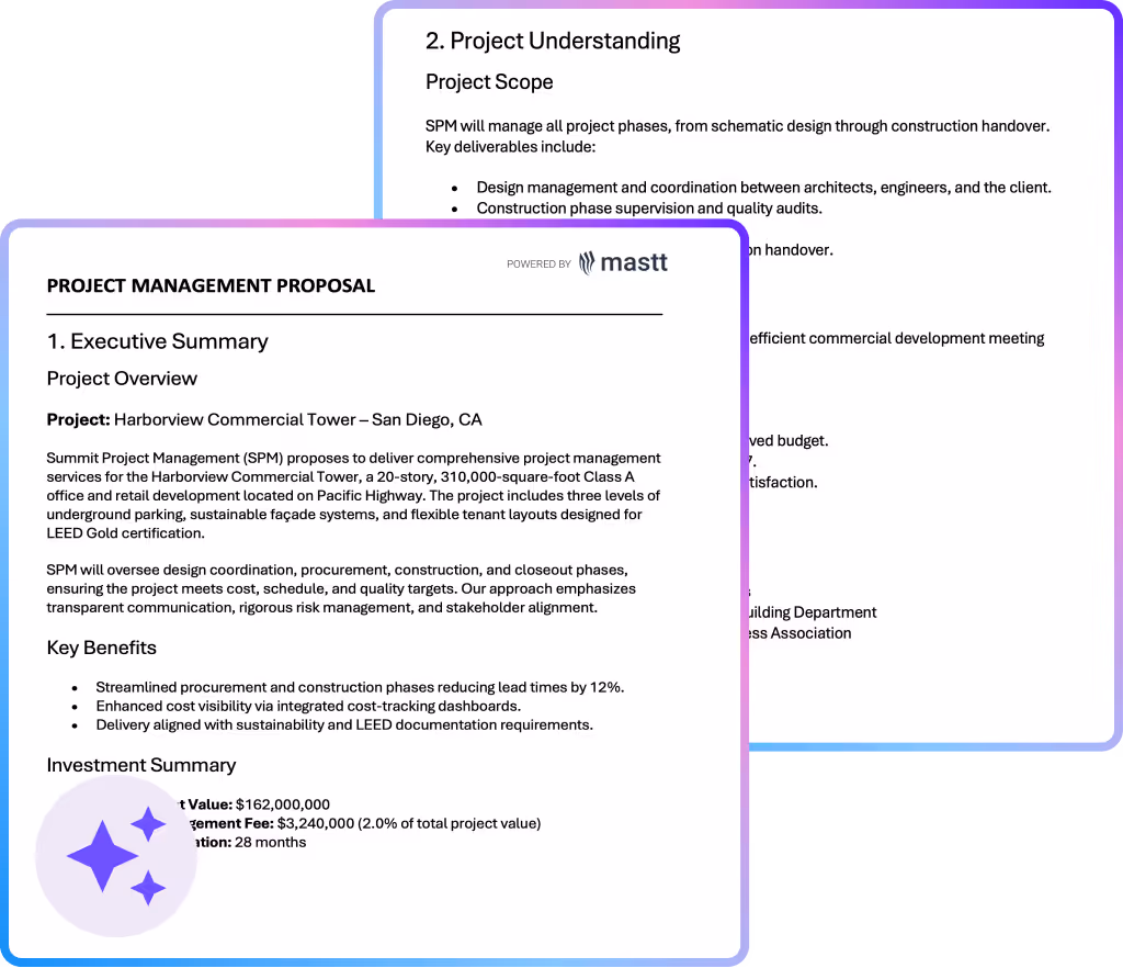 Use this project management proposal template to win more construction PM work. Get the essential framework for presenting your scope, fees, methodology, and qualifications to clients professionally and efficiently.