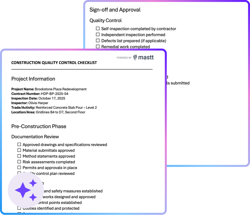 Building quality control checklists from scratch wastes time you could spend managing actual inspections. Mastt AI generates customized inspection checklists in seconds, structured specifically for your project type and quality requirements.