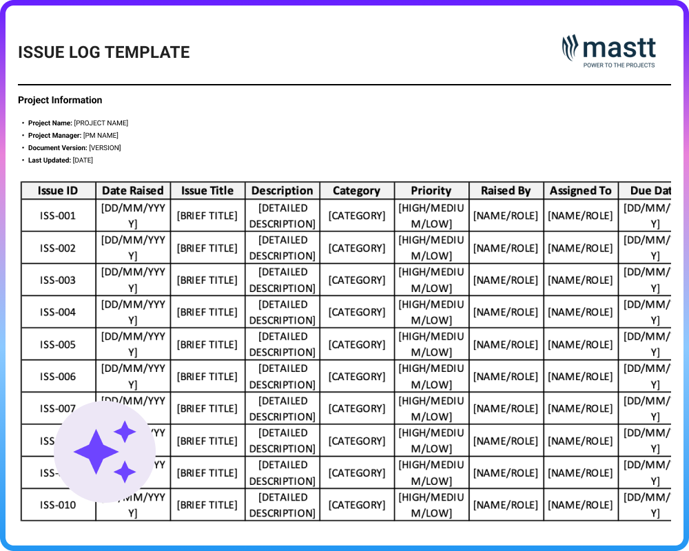 👉 Start building your issue log template with Mastt AI and bring structure to every issue before it becomes a delay.